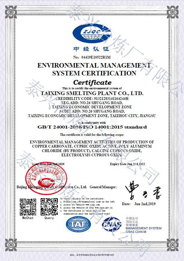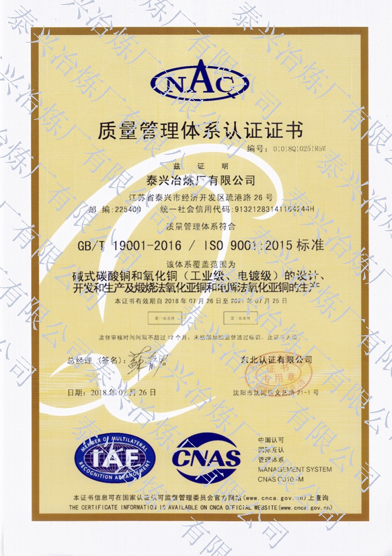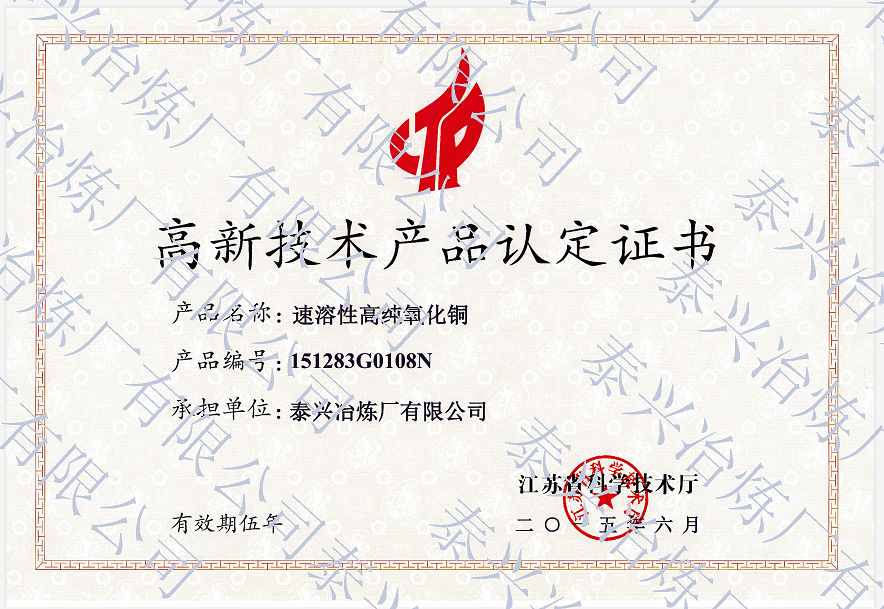 泰興冶煉廠有限公司(原泰興冶煉廠),始建于20世紀70年代初,現(xiàn)位于江蘇省泰興經(jīng)濟開發(fā)區(qū)。歷經(jīng)40年的創(chuàng)新驅(qū)動、穩(wěn)健發(fā)展,已成長為一家專業(yè)生產(chǎn)堿式碳酸銅、高純電鍍氧化銅、氧化亞銅、氧化銅、無水硫酸銅、海綿銅粉及副產(chǎn)品聚氯化鋁(凈水劑)等系列無機鹽產(chǎn)品及處置不含氨的氯化銅蝕刻液(HW22)15000噸/年的“國家高新技術(shù)企業(yè)”和地方性骨干企業(yè)。公司總占地面積3.7萬平方米,建筑面積4萬平方米,注冊資本2088萬元,固定資產(chǎn)1.2億元,年產(chǎn)值約7億元。